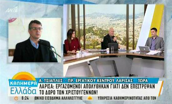 «Υπάρχουν εταιρίες και στον κλάδο της φύλαξης, της καθαριότητας και του επισιτισμού και αντίστοιχα του εμπορίου που αρχίζουν και παρακρατούν και μέρος των μισθών. Καταθέτουν τον μισθό κανονικά στην τράπεζα και υποχρεώνουν ένα μέρος από τον μισθό να το επιστρέψουν πίσω, υπό την απειλή της απόλυσης», αποκάλυψε ο πρόεδρος του Εργατικού Κέντρου Λάρισας με αφορμή την απόλυση εργαζομένων που δεν επέστρεψαν στον εργοδότη το δώρο των Χριστουγέννων.