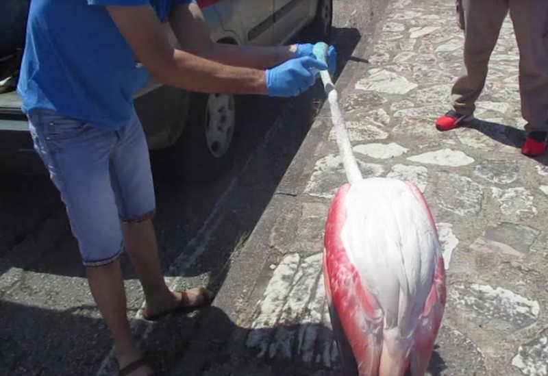 Το Φοινικόπτερο (Phoenicopterus ruber), βρέθηκε απομονωμένο στην περιοχή μεταξύ της Παλαιοπαναγίας και του Πλατανίτη του Δήμου Ναυπακτίας. Καθώς στην περιοχή αυτή δεν απαντώνται φοινικόπτερα, μεταφέρθηκε από πολίτες στο Δασαρχείο Ναυπάκτου το οποίο στην συνέχεια ήρθε σε τηλεφωνική επικοινωνία με τον Φορέα Διαχείρισης Λιμνοθάλασσας Μεσολογγίου – Ακαρνανικών Ορέων. Το πτηνό μεταφέρθηκε στην λεκάνη της Πλώσταινας στο Μεσολόγγι, όπου αφού του έγινε μαρκάρισμα για την προσωρινή παρακολούθηση του, αφέθηκε ελεύθερο ώστε να προσαρμοστεί στο φυσικό του περιβάλλον.