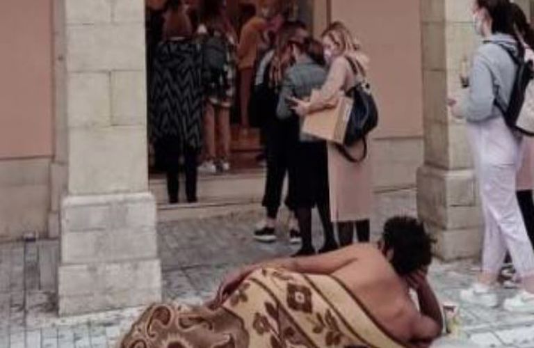 Απίστευτο σκηνικό στην Πάτρα: Ημίγυμνος άνδρας είχε ξαπλώσει μπροστά σε πολυκατάστημα (Photo)