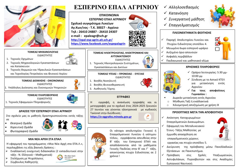 Το Εσπερινό ΕΠΑ.Λ. Αγρινίου θα παραμείνει ανοικτό για την εξυπηρέτηση όσων επιθυμούν να κάνουν την εγγραφή στο Σχολείο ή για την κατάθεση των δικαιολογητικών κάθε ημέρα (18:00-21:00) από την Πέμπτη 27/6 έως και την Παρασκευή 05/07.