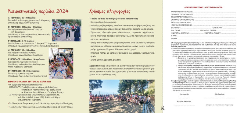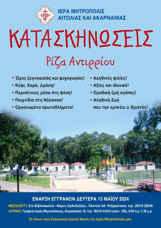 Από σήμερα Δευτέρα, 13 Μαΐου 2024 ξεκινούν οι εγγραφές στις Κατασκηνώσεις της Ιεράς Μητροπόλεως Αιτωλίας και Ακαρνανίας.