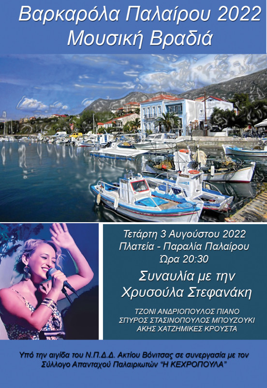 Μετά το τέλος της Βαρκαρόλας και στις 22:00 θα ακολουθήσει στην Πλατεία της Παλαίρου μουσική βραδιά με ζωντανή ορχήστρα .