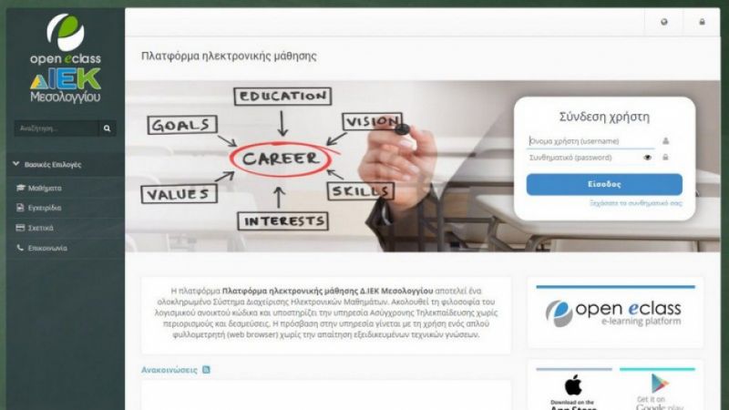 Η πλατφόρμα ηλεκτρονικής μάθησης Δ.ΙΕΚ Μεσολογγίουβρίσκεται στην ηλεκτρονική διεύθυνση http://eclass.iekmesol.sch.gr