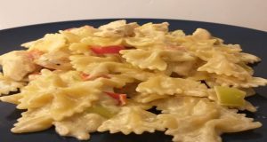 Υλικά (για 4 άτομα): -500 γραμμ. φιογκάκια -2 φιλέτα κοτόπουλο -1 κρεμμύδι -1 σκελίδα σκόρδο -1 κόκκινη πιπεριά -1 πράσινη πιπεριά -1 κρέμα γάλακτος (μεγάλη) -ελαιόλαδο...
