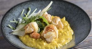 Συστατικά 500 γρ. γαρίδες, tiger, ακαθάριστες 1,5 λίτρο νερό, βραστό 1/2 γρ. κρόκο Κοζάνης (σαφράν) 1 κύβο κότας Maggi 2 κρεμμύδια 2 σκ. σκόρδο 1 πρέζα ζάχαρη...