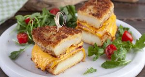 Συστατικά 1 πατάτα, (500 γρ.) 100 γρ. αλεύρι γ.ο.χ. 1 αβγό 100 γρ. πάνκο 100 γρ. σπορέλαιο Για τη σύνθεση 8 φέτες τσένταρ 2 φέτες ζαμπόν...