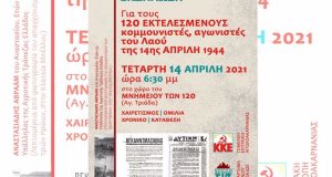 Η Τομεακή Επιτροπή Αιτωλοακαρνανίας του ΚΚΕ και το Παράρτημα Αγρινίου της ΠΕΑΕΑ-ΔΣΕ, διοργανώνουν εκδήλωση για να τιμήσουν την εκτέλεση των 120 κομμουνιστών, αγωνιστών, ΕΑΜιτών, από τους...