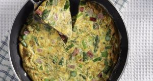 Ανοιξιάτικη ομελέτα με φρέσκα λαχανικά εποχής. Υλικά 7 αυγά, ελαφρώς χτυπημένα με λίγο αλατοπίπερο 8 πράσινα σπαράγγια 150 γρ. σύγλινο, σε κυβάκια 40 ml ελαιόλαδο 3...