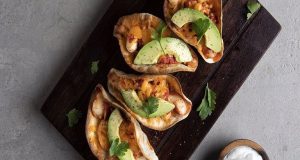 Συστατικά Για τα τάκος 4 τορτίγιες, 12 εκ. 200 γρ. γίγαντες, σε κόκκινη σάλτσα, που έχουν περισσέψει 1 κ.γ. κύμινο 1 πρέζα μπούκοβο 100 γρ. τσένταρ,...