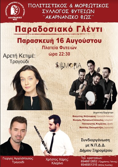 Ο Πολιτιστικός & Μορφωτικός Σύλλογος Φυτειών “Ακαρνανικό Φως” σας προσκαλεί την Παρασκευή 16 Αυγούστου 2019 σ΄ενα αυθεντικό παραδοσιακό γλέντι που θα πραγματοποιηθεί στα πλαίσια των πολιτιστικών εκδηλώσεων του συλλόγου “Αύγουστος 2019”.
