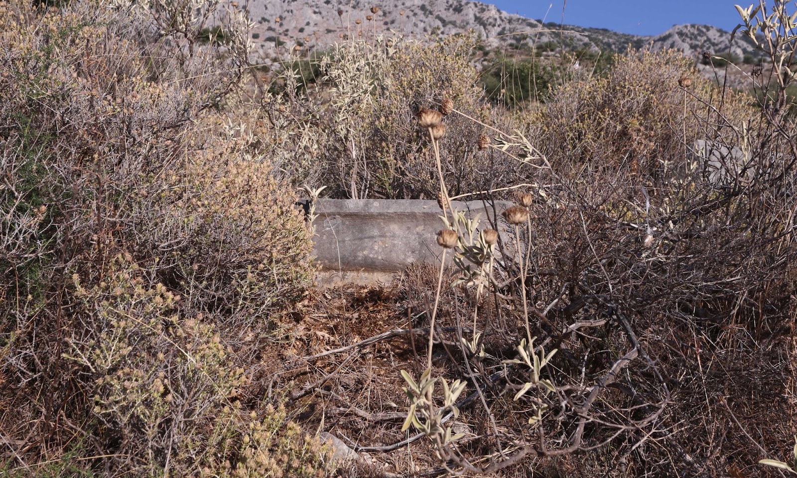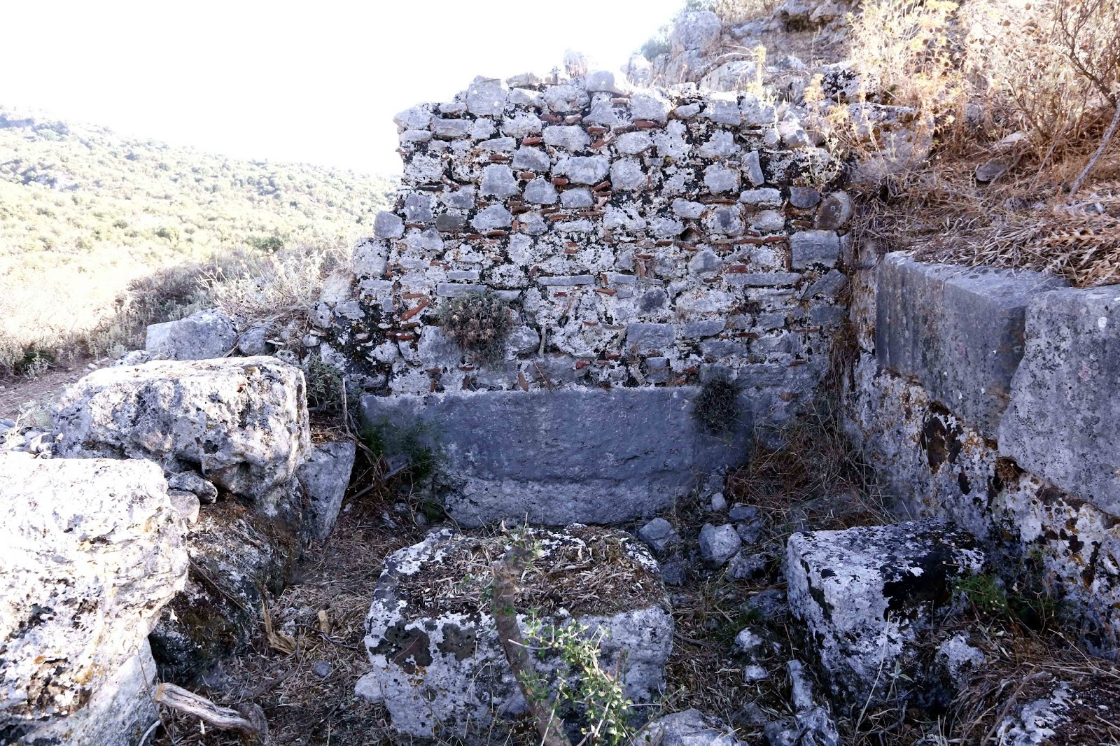 Αφού πέρασαν και αυτά από τον φωτογραφικό φακό (ΣΗΜΕΙΩΝΩ ΕΔΩ για τυχόν παρεξηγήσεις ότι η περιοχή δεν είναι (προ)φυλαγμένη στοιχειωδώς ούτε περιφραγμένη για να προστατεύονται τα μνημεία. Είναι ελεύθερη σε όλους, σε τυχαίους (με πολλές έννοιες η λέξη) περαστικούς έως τους γιδοβοσκούς που συναντάς),συνέχισα με πιο γρήγορο ρυθμό διότι η θερμοκρασία άρχισε να ανεβαίνει επικίνδυνα, φθάνοντας και σε άλλες περιοχές όπου μπορούσες να διακρίνεις αρχαίες εκκλησίες αρχαίους τάφους, αρχαία τείχη και πολλά άλλα μνημεία εξαιρετικού ενδιαφέροντος καταλήγοντας σε ένα περιφραγμένο χώρο όπου δεσπόζει το πιο συγκλονιστικό μνημείο. Τα ερείπια αρχαίου ναού με το δάπεδο και τους κίονες. Μνημείο που εκατοντάδες χρόνια έχει μείνει στην αφάνεια.