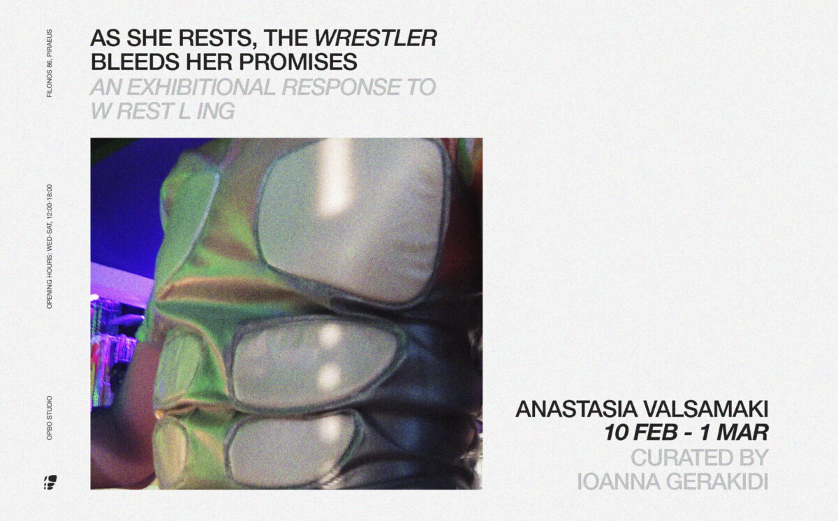 Φιλοξενούμενη στο opbo studio μέχρι την 1η Μαρτίου, η έκθεση “as she rests, the wrestler bleeds her promises”, σε επιμέλεια της Ιωάννας Γερακίδη, είναι μία παρουσίαση από γλυπτικές χειρονομίες, φωτογραφικά και άλλα αρχειακά υλικά που εκκινούν ή συνομιλούν με τη χορευτική περφόρμανς “W REST L ING”. Η περφόρμανς, σε σύλληψη και χορογραφία της Αναστασίας Βαλσαμάκη, παρουσιάστηκε το βράδυ των εγκαινίων (10/2).