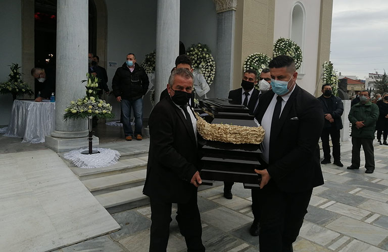 Η εξόδιος ακολουθία τελέστηκε από τον Αρχιμανδρίτη Πατήρ Δαβίδ Μπαζουλα, τον Αρχιμανδρίτη Ιερόθεο Κοκκωση, τον Πρωτοπρεσβύτερο Πατήρ Δημήτριο Τέγα και τον Πατήρ Θεόδωρο Τριάντη με Ιεροψάλτες τον Κον Παναγιώτη Βουρλέτση και τον Κον Κωνσταντίνο Λαγό.