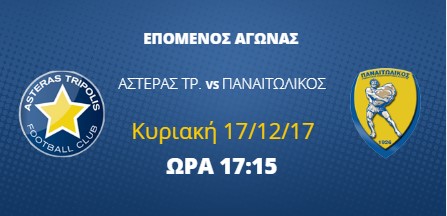 Συντονιστείτε, σήμερα, Κυριακή 17 Δεκεμβρίου, στις 17:15 στην αθλητική συχνότητα της Αιτωλοακαρνανίας στους 93,7 στα fm κι ακούστε σε ζωντανή μετάδοση το παιχνίδι Αστέρας Τρίπολης – Παναιτωλικός
