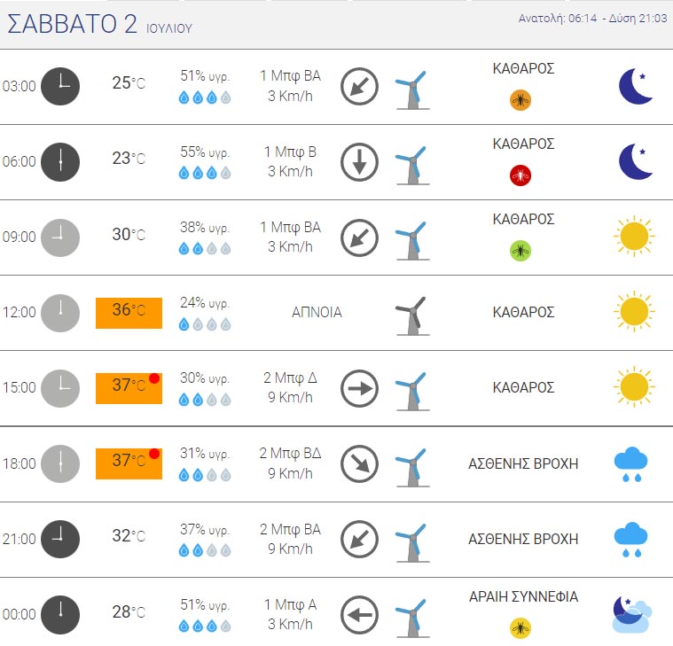 Πιο αναλυτικά, το Σάββατ0 2 Ιουλίου 2022, σε ολόκληρη τη χώρα αναμένεται ηλιοφάνεια με λίγες τοπικές νεφώσεις, ενώ δυσμενείς πυρομετεωρολογικές συνθήκες θα επικρατήσουν στα ανατολικά και νότια τμήματα. Από τις μεσημεριανές ώρες οι νεφώσεις στα ηπειρωτικά θα αυξηθούν και θα εκδηλωθούν όμβροι και μεμονωμένες καταιγίδες στα ορεινά.
