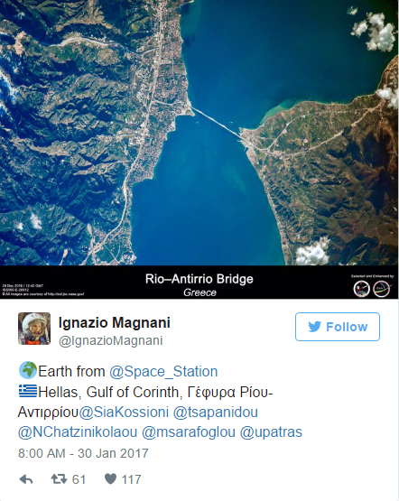 Δεν είναι η πρώτη φορά που ο Ιταλός αστροναύτης αφιερώνει κάποια ανάρτηση στη χώρα μας. Από την αρχή του ταξιδιού του, έχει ανεβάσει πολλές φωτογραφίες της Ελλάδας από το διάστημα. Η τελευταία του ανάρτηση μάλιστα έγινε μόλις σήμερα το πρωί, όταν ο Μανιάνι ανήρτησε μία φωτογραφία της γέφυρας του Ρίου-Αντιρίου από τη μοναδική οπτική του γωνία.