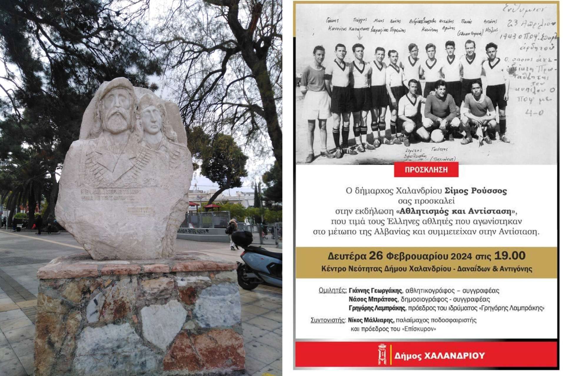 Τίτλος της «Αθλητισμός και Αντίσταση», και όπως επισημαίνει ο Δήμος Χαλανδρίου, θα πραγματοποιηθεί: «τη Δευτέρα 26 Φεβρουαρίου 2024, στις 19.00, στο Κέντρο Νεότητας του Δήμου Χαλανδρίου (Δαναΐδων & Αντιγόνης), με στόχο να φωτιστεί ο ρόλος και η συμμετοχή των Ελλήνων αθλητών στο μέτωπο της Αλβανίας αλλά και στις πράξεις αντίστασης, αλληλεγγύης και στήριξης του δοκιμαζόμενου λαού, κατά τη διάρκεια της Κατοχής.