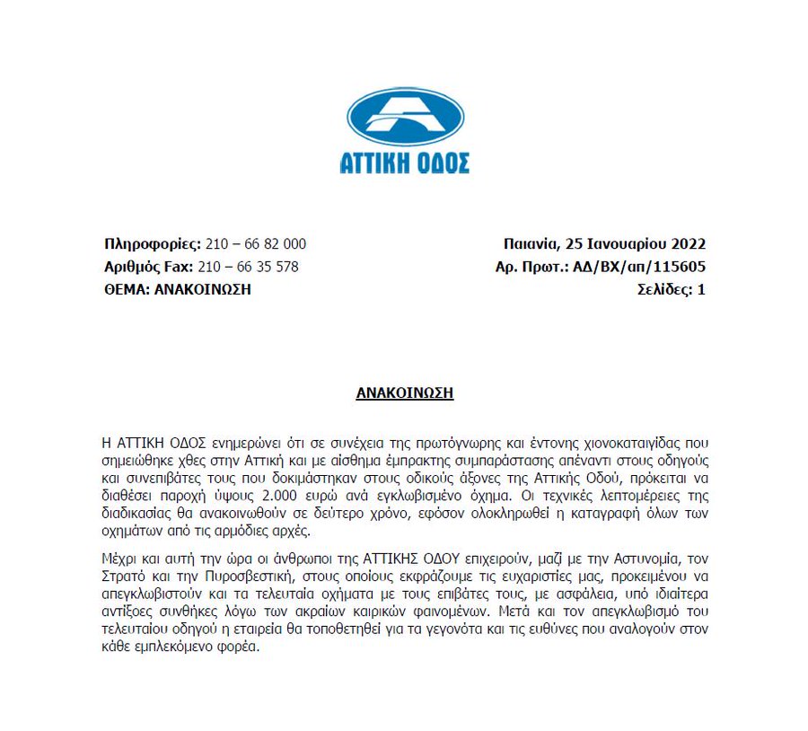 Η ΑΤΤΙΚΗ ΟΔΟΣ ενημερώνει ότι σε συνέχεια της πρωτόγνωρης και έντονης χιονοκαταιγίδας που σημειώθηκε χθες στην Αττική και με αίσθημα έμπρακτης συμπαράστασης απέναντι στους οδηγούς και συνεπιβάτες τους που δοκιμάστηκαν στους οδικούς άξονες της Αττικής Οδού, πρόκειται να διαθέσει παροχή ύψους 2.000 ευρώ ανά εγκλωβισμένο όχημα. Οι τεχνικές λεπτομέρειες της διαδικασίας θα ανακοινωθούν σε δεύτερο χρόνο, εφόσον ολοκληρωθεί η καταγραφή όλων των οχημάτων από τις αρμόδιες αρχές.