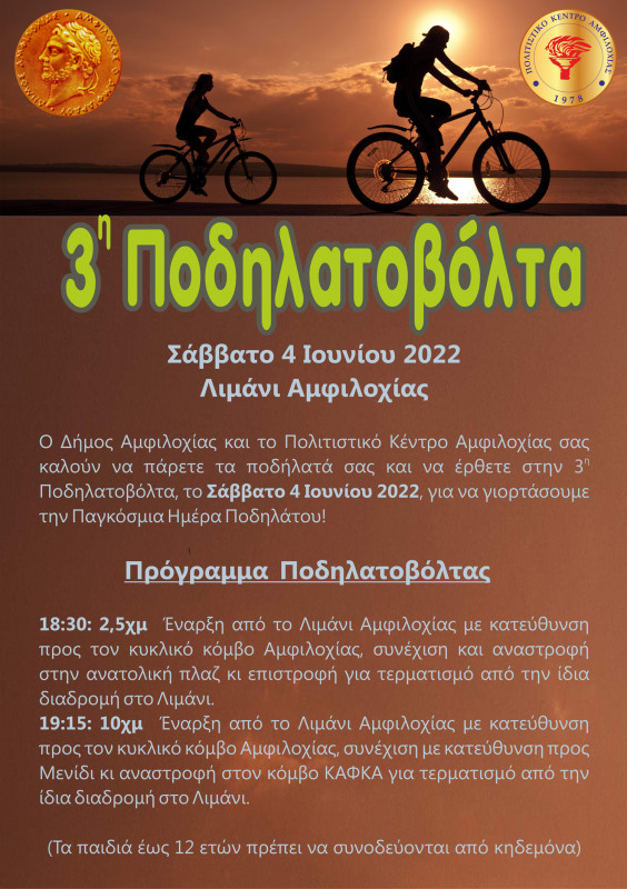 Ο Δήμος Αμφιλοχίας και το Πολιτιστικό Κέντρο Αμφιλοχίας γιορτάζουν την Παγκόσμια Ημέρα Ποδηλάτου (3 Ιουνίου) και σας καλούν να πάρετε τα ποδήλατά σας και να έρθετε στην 3η Ποδηλατοβόλτα που θα πραγματοποιηθεί το απόγευμα στο Λιμάνι της πόλης.