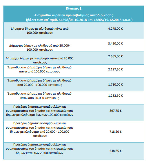 Σύμφωνα με τον «Οδηγό» το ύψος της αντιμισθίας των δημάρχων καθορίζεται με την υπ’ αριθ. 54698/5.10.2018 (Β’ 4704) κοινή απόφαση των Υπουργών Οικονομικών και Εσωτερικών, όπως τροποποιήθηκε με την υπ’ αρ. 72865/10.12.2018 (Β’ 5726) όμοια απόφαση. Με τις προαναφερθείσες