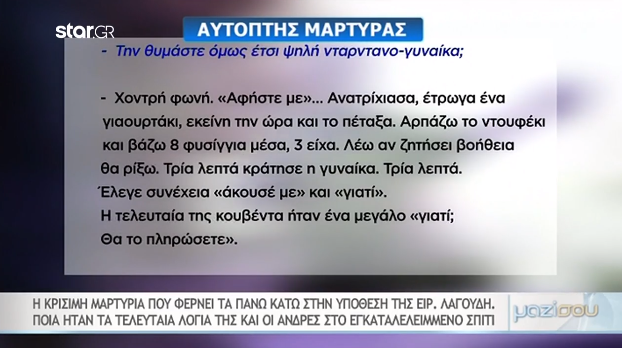 Συγκλονιστική είναι η περιγραφή του αυτόπτη μάρτυρα ο οποίος ισχυρίζεται πως είδε καρέ καρέ όλα όσα έγιναν την ημέρα που πέθανε η Ειρήνη Λαγούδη.