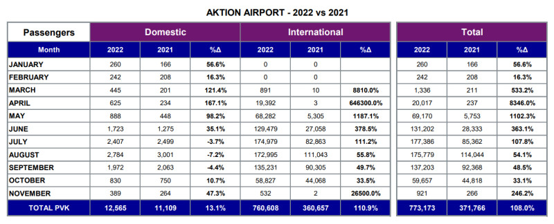 Αυξηση 23,6% για το Αεροδρόμιο Ακτίου το εντεκάμηνο του 2022