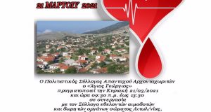 Ο Πολιτιστικός Σύλλογος Απανταχού Αρχοντοχωριτών ο «Άγιος Γεώργιος» πραγματοποιεί την Κυριακή 21/03/2021 και ώρα 09:30 π.μ. έως 13:30 σε συνεργασία με τον Σύλλογο εθελοντών αιμοδοτών και...