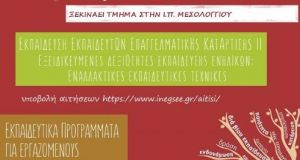 Το Ινστιτούτο Εργασίας της Γ.Σ.Ε.Ε. υλοποιεί στην Περιφέρεια Δυτικής Ελλάδας εξειδικευμένα προγράμματα κατάρτισης για εργαζόμενους του ιδιωτικού τομέα. Συγκεκριμένα, στο Μεσολόγγι θα ξεκινήσει στις 22 Μαρτίου 2020 το...