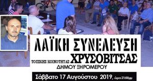 Ο Πρόεδρος της τοπικής κοινότητας Χρυσοβίτσας, Γιάννης Χρόνης, σας προσκαλεί στη συνέλευση Κατοίκων της τοπικής κοινότητας που θα παραγματοποιηθεί αύριο, Σάββατο, 17 Αυγούστου 2019 και ώρα...