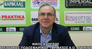 Δηλώσεις του υπεύθυνου ποδοσφαιρικού τμήματος του Α.Ο. Αγρινίου Νίκου Χολέβα μετά τον αγώνα της ομάδας του Γιάννη Διαμαντάκου κόντρα στον Φίλιππο Βέροιας.