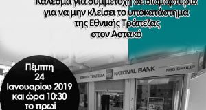 Ο Σύλλογος Γυναικών Αστακού, απευθύνει κάλεσμα σε όλους τους συλλόγους, φορείς και πολίτες του τόπου μας για συμμετοχή σε διαμαρτυρία ενάντια στην απόφαση της Διοίκησης της Εθνικής Τράπεζας να κλείσει το κατάστημά...