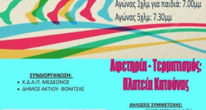 Το Κέντρο Δημιουργικής Απασχόλησης Παιδιών Μεδεώνος σε συνεργασία με τη Δημοτική Κοινωφελή Επιχείρηση του Δήμου Ακτίου – Βόνιτσας, προκηρύσσει την διοργάνωση του 1ου Λαϊκού Αγώνα Δρόμου...