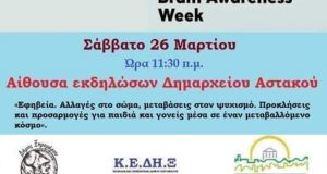 Στο πλαίσιο της «Εβδομάδας Ενημέρωσης για τον εγκέφαλο» (Brain Awareness Week), διοργανώνεται το Σάββατο 26 Μαρτίου, στις 11:30 π.μ. στην Αίθουσα εκδηλώσεων του Δημαρχείου Αστακού, ενημέρωτική...