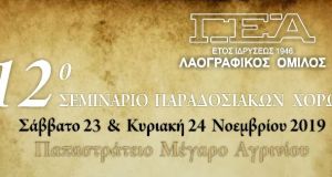 Ο Λαογραφικός Όμιλος της Γυμναστικής Εταιρείας Αγρινίου (Γ.Ε.Α.) διοργανώνει για δωδέκατη συνεχή χρονιά Σεμινάριο Παραδοσιακών Χορών στις 23 και 24 Νοεμβρίου 2019 στο Παπαστράτειο Μέγαρο Αγρινίου....