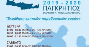 Ξεκινούν την ερχόμενη Δευτέρα, 2 Σεπτεμβρίου 2019 τα μαθήματα παραδοσιακών χορών στον Παγκρήτιο Σύλλογο Αιτωλοακαρνανίας που εδρεύει στο Αγρίνιο (Εθνικής Αντιστάσεως, 34). Διδασκαλία χορών: Αργυρώ Νικολοπούλου...