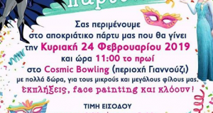 Ο Σύλλογος Γονέων και Κηδεμόνων του 1ου Δημοτικού Σχολείου Νεάπολης σας προσκαλεί στον ετήσιο αποκριάτικο χορό την Κυριακή 24 Φεβρουαρίου 2019 και ώρα 4 μ.μ. στο κέντρο «Κτήμα...
