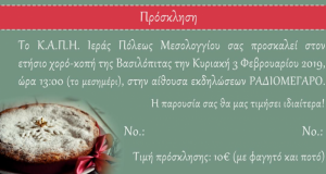 Το Κέντρο Ανοικτής Προστασίας Ηλικιωμένων (Κ.Α.Π.Η.) του Δήμου Ιεράς Πόλεως Μεσολογγίου, διοργανώνει αύριο Κυριακή 3 Φεβρουαρίου, τον ετήσιο χορό και την κοπή της Πρωτοχρονιάτικης Πίτας του....
