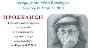 Το Μουσικό Σχολείο Αγρινίου σας προσκαλεί σ’ ένα Αφιέρωμα στο στιχουργό – ποιητή Μάνο Ελευθερίου την Κυριακή 18.03.2018 και ώρα 20:00 στην αίθουσα εκδηλώσεων του σχολείου....