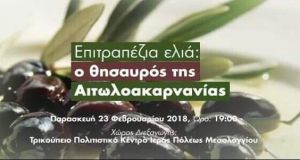 Την Παρασκευή 23 Φεβρουαρίου 2018 και ώρα 19:00, στο Τρικούπειο Πολιτιστικό Κέντρο Ιεράς Πόλεως Μεσολογγίου, η Νομαρχιακή Επιτροπή ΟΝΝΕΔ Αιτωλοακαρνανίας διοργανώνει εκδήλωση με θέμα «Επιτραπέζια Ελιά: Ο Θησαυρός της...