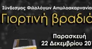 Ο Σύνδεσμος Φιλολόγων Αιτωλοακαρνανίας προσκαλεί στη γιορτινή βραδιά που διοργανώνει στις 22 Δεκεμβρίου 2017, ημέρα Παρασκευή και ώρα 22:00, στο café «Αύλιον». Βραδιά με πολλά δώρα και εκπλήξεις.