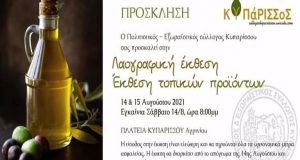 Στα πλαίσια των καλοκαιρινών πολιτιστικών εκδηλώσεων ο σύλλογος Κυπαρίσσου διοργανώνει έκθεση προϊόντων στην πλατεία του χωριού στις 14 και 15 Αυγούστου.(εγκαίνια το Σάββατο 14/8 στις 8:00μμ) ...