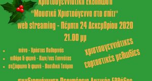 Χριστουγεννιάτικη εκδήλωση εξ’ αποστάσεως από το Κατηχητικό του Αγίου Δημητρίου Αγρινίου Την Τετάρτη 23 Δεκεμβρίου το απόγευμα και ώρα 7 μ.μ. θα πραγματοποιηθεί εξ αποστάσεως, λόγω...
