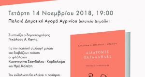 H Λέσχη Ανάγνωσης της Κοινωφελούς Επιχείρησης του Δήμου Αγρινίου, οι εκδόσεις ΓΑΒΡΙΗΛΙΔΗΣ και το Βιβλιοπωλείο «Βιβλιοτρόπιο» συνδιοργανώνουν την παρουσίαση της ποιητικής συλλογής: «ΔΙΑΔΡΟΜΕΣ ΠΑΡΑΛΛΗΛΕΣ» της Κατερίνας...