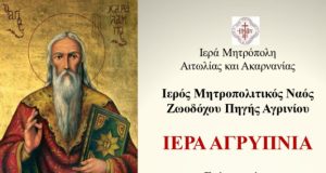 Αγρίνιο: Ιερά Αγρυπνία στον Ιερό Μητροπολιτικό Ναό Ζωοδόχου Πηγής Το ερχόμενο Σάββατο, 10 Φεβρουαρίου 2024 η Εκκλησία μας τιμά την μνήμη του Αγίου Ιερομάρτυρος Χαραλάμπους του...