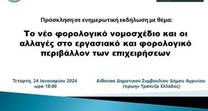 Αγρίνιο: Ενημέρωση για το νέο φορολογικό από τους Επιχειρηματίες και τους Λογιστές Εξαιρετικά χρήσιμη αναμένεται να αποδειχθεί η ενημερωτική εκδήλωση που θα πραγματοποιήσουν την Τετάρτη, 24...