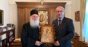 Στην Ιερά Μονή Βατοπεδίου δέχθηκε σήμερα ο Καθηγούμενος της Ιεράς Μονής π.Εφραίμ τον Δήμαρχο Θέρμου, Σπύρο Κωνσταντάρα, με τον δεύτερο να παραδίδει εικόνα της Παναγίας Προυσιωτίσσης...