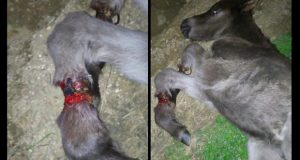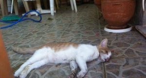 Πεσμένο στο έδαφος να κείτεται αβοήθητο μέσα σ’ ένα αυλάκι και με μεγάλες πληγές στα πόδια του από το παστούρωμα (το σφιχτό δέσιμο των άκρων με...