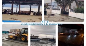 Δύσκολη ήταν η αποψινή νύχτα στο Αντίρριο με τους δυνατούς ανέμους και τα τεράστια κύματα να γεμίζουν με θαλασσινό νερό τους δρόμους και τα φερτά υλικά...