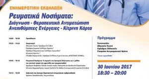 Εκδήλωση ενημέρωσης και ευαισθητοποίησης του κοινού, των νοσούντων και των επαγγελματιών υγείας για τα ρευματικά νοσήματα με θέμα «Ρευματικά νοσήματα. Διάγνωση-θεραπευτική αντιμετώπιση, ανεπιθύμητες ενέργειες, κίτρινη κάρτα»...