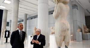 Ο πρόεδρος Ομπάμα έφυγε από το Μουσείο της Ακρόπολης με δύο δώρα που του πρόσφερε ο διευθυντής του Μουσείου, καθηγητής Δημήτρης Παντερμαλής: ένα αντίγραφο της «σκεπτόμενης...
